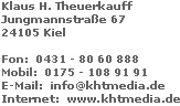 Klaus H. Theuerkauff Jungmannstraße 67 24105 Kiel Tel. 0431 - 80 60 888 Email: info (ät) khtmedia.de Web: www.khtmedia.de/